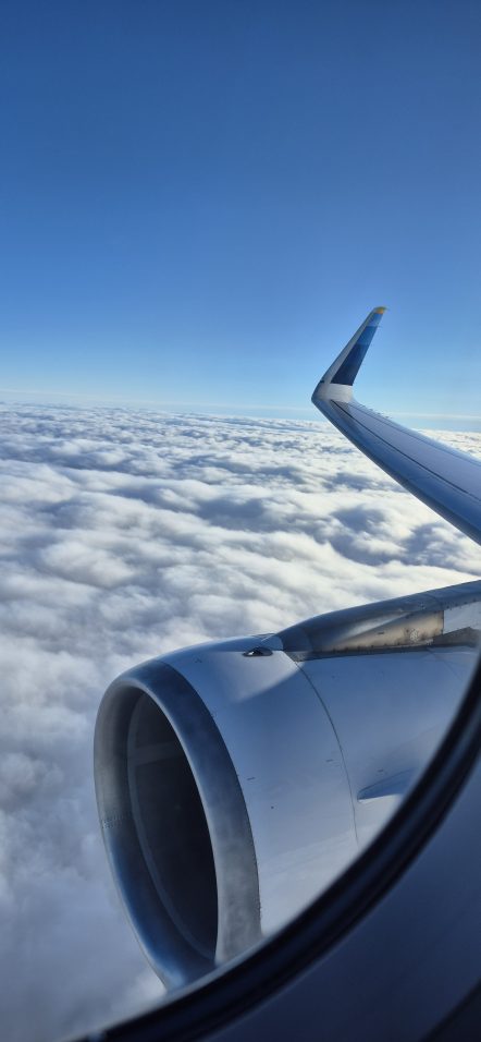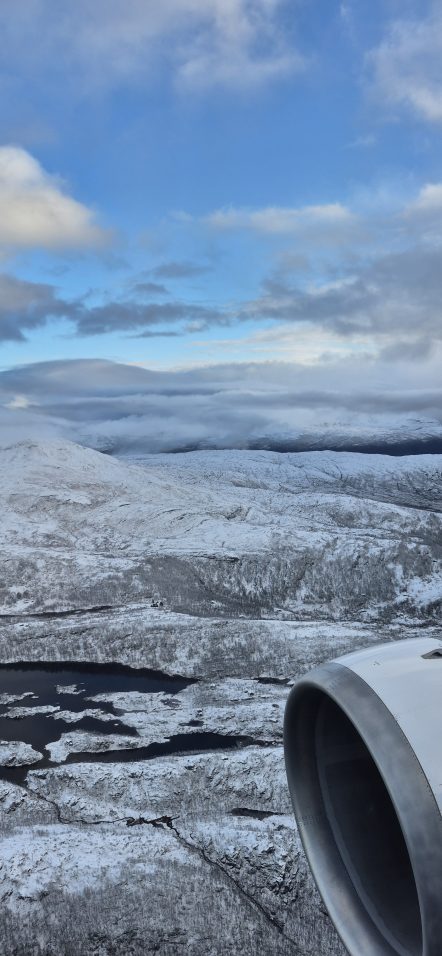 Los ging es ab Frankfurt mit einem Direktflug nach Harstadt/Narvik- Flughafen Evenes mit Discover Airlines und einem Airbus A320-200. Die gut 3 Stunden Flugzeit vergingen auf den bequemen und mit ausreichend viel Beinfreiheit versehenen Sitzplätzen der Economy Class, förmlich und praktisch wie im Flug. Bei klarem Sonnenschein konnten wir lang die dänische Küste und das Schärenmeer Norwegens bewundern, bis sich die Lofoten (80 Inseln!) mit majestätischen, schneebedeckten Bergen zeigten.