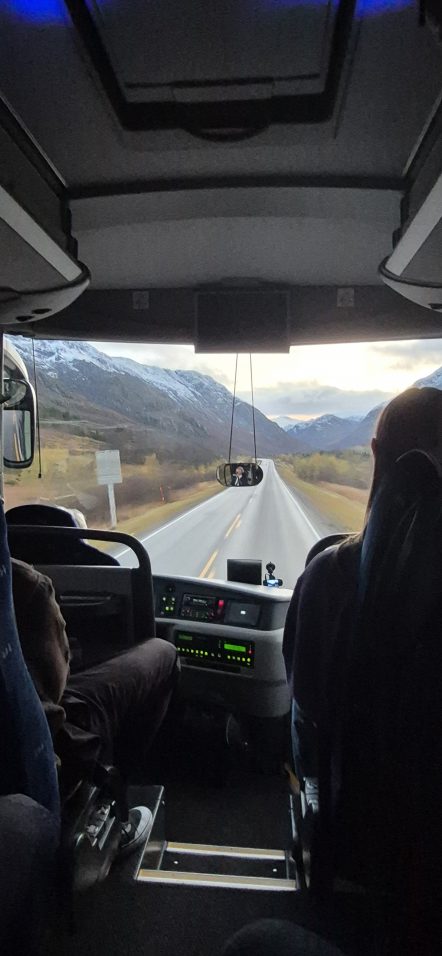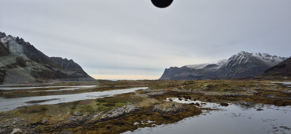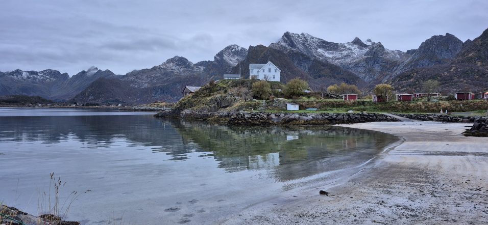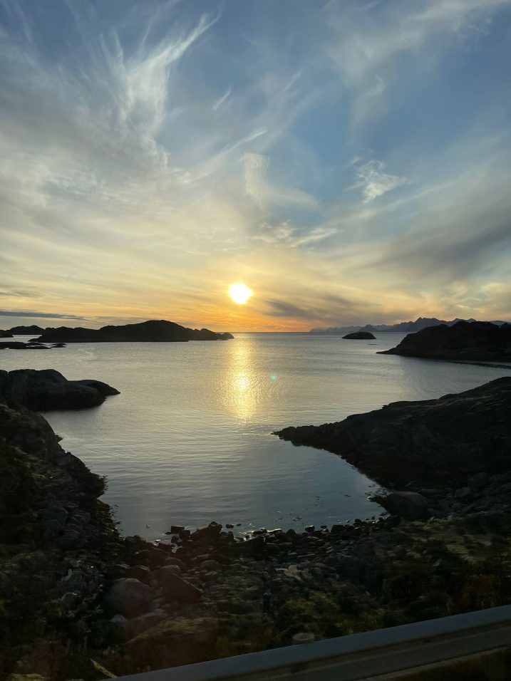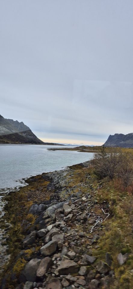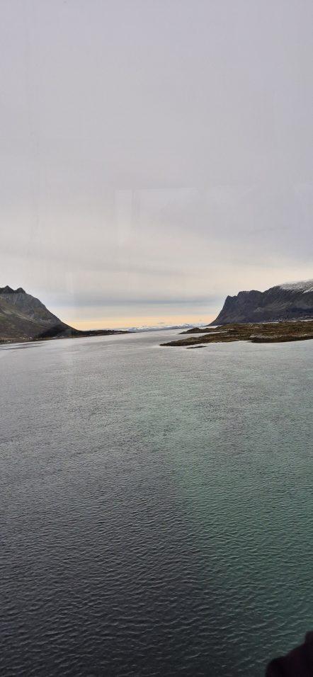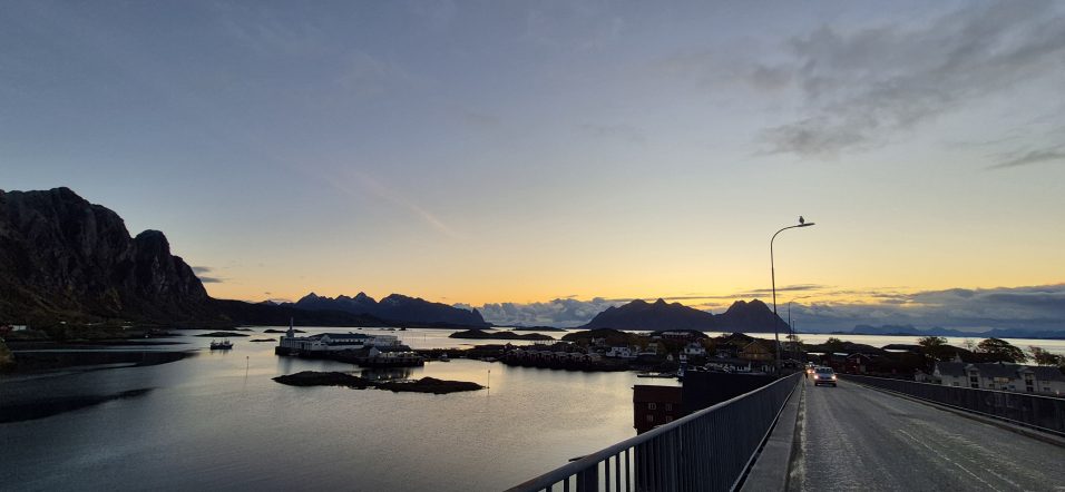 Klare, kalte unendlich reine Luft kam uns auf der kleinen Gangway entgegen. Die Sonne schenkte uns noch ein paar letzte warme Strahlen, bis sie hinter den schneebedeckten Bergen unterging und die Temperaturen merklich sinken ließ. Zweieinhalb Stunden konnten wir nun die Transfer-Fahrt auf einer der schönsten Küstenstraßen Europas, der E10, zu unserem ersten Ziel, „Svinoya Rorbuer“ in Svolvaer, erleben.