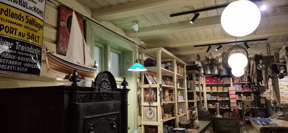 Aus dem Hauptgebäube, ein Lagerhaus und Svolvaers erstes Kolonialwarengeschäft von 1828, wurde zwischenzeitlich ein Museum und kleiner Souvenir-Shop. Es ist noch immer wie damals gut bestückt und zeigt von der Decke bis zur kleinsten Ecke den gut genutzten Warenraum. Hier befindet sich übrigens auch die Rezeption der Rorbuer.
