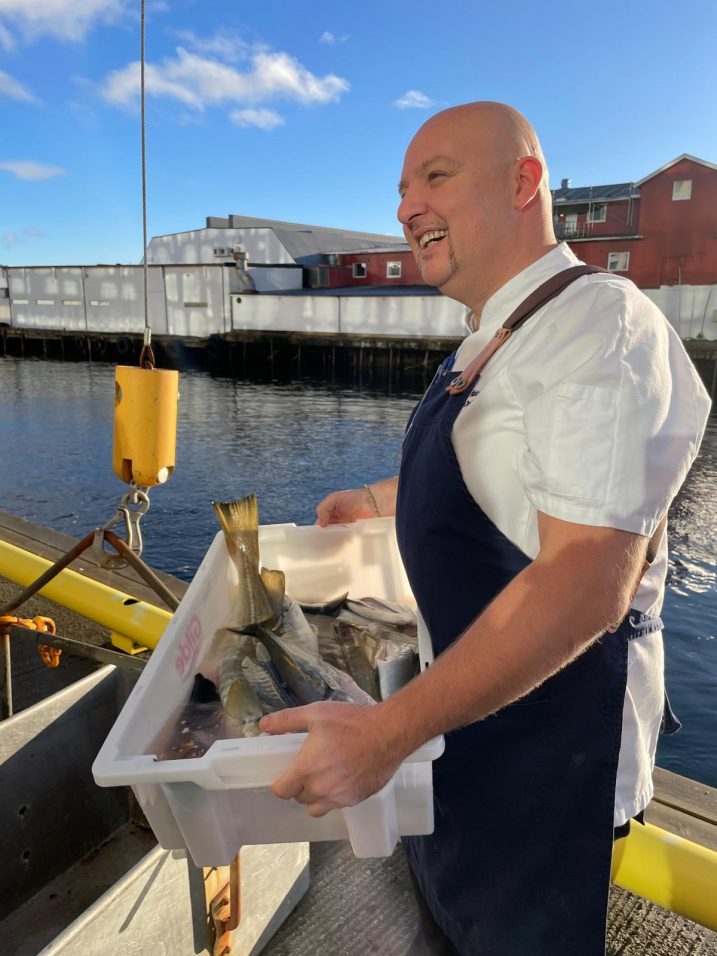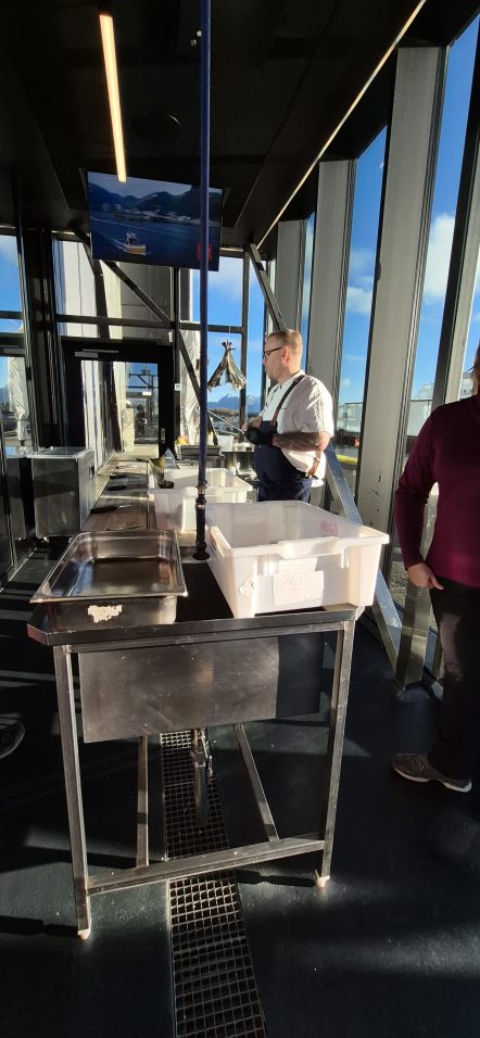 Während wir sportlich und gechillt die umliegende, beeindruckende Wasserlandschaft erkundeten, begab sich unsere „andere Hälfte“ auf Fischfang. Auch hier natürlich gut eingepackt von XXLofoten. Der folgende, morgendliche Fang wurde mittags per Kran von Bord gehievt und zur Weiterverarbeitung in unser zweites Hotel, das Thon Hotel Svolvaer gebracht. Dort, keine 5 Meter vom Anleger entfernt, wurde fleißig unter Anleitung der Hotel-Crew gesäubert und filetiert (wer wollte😉).
