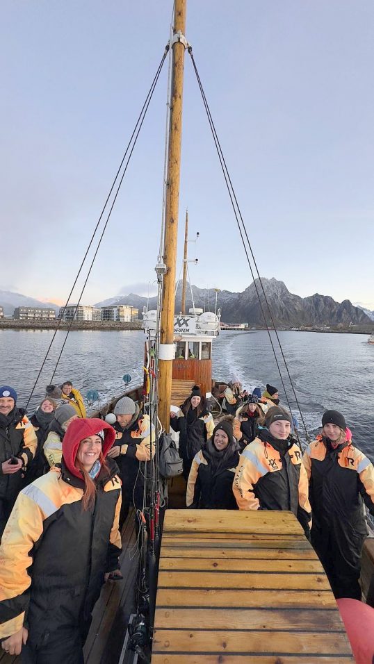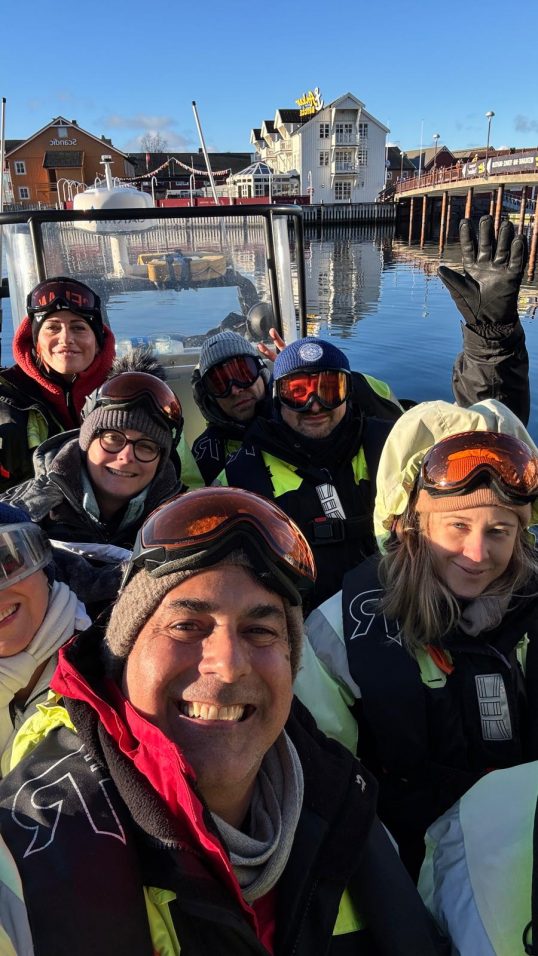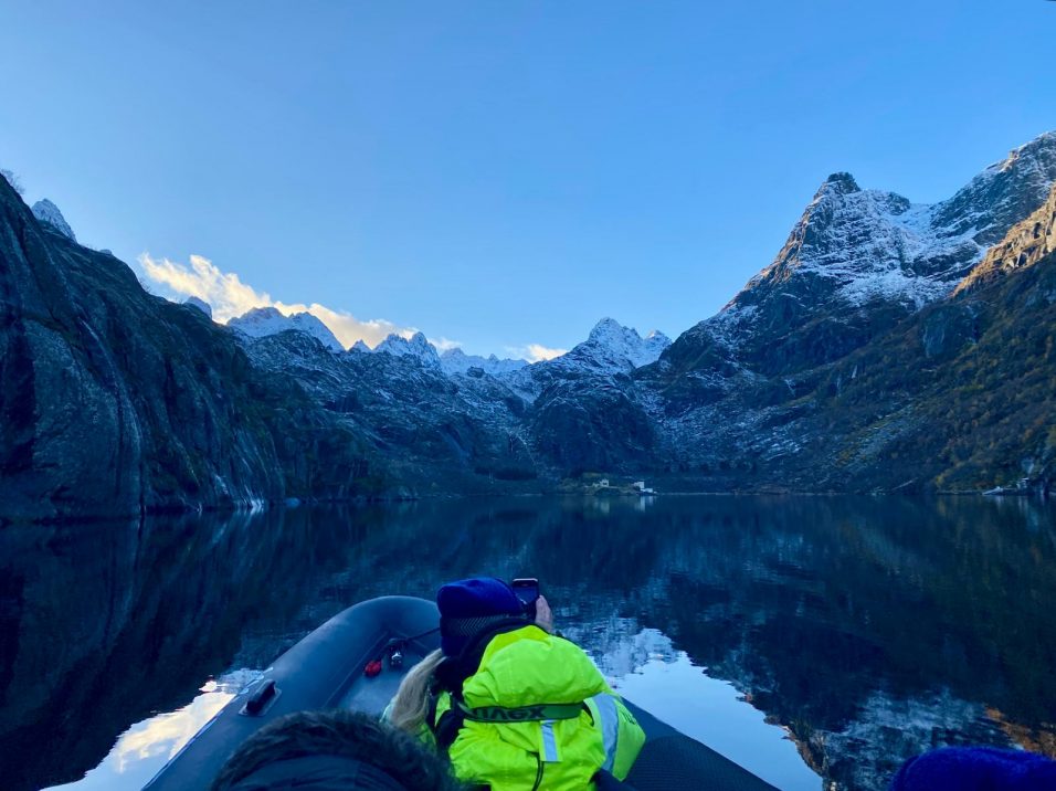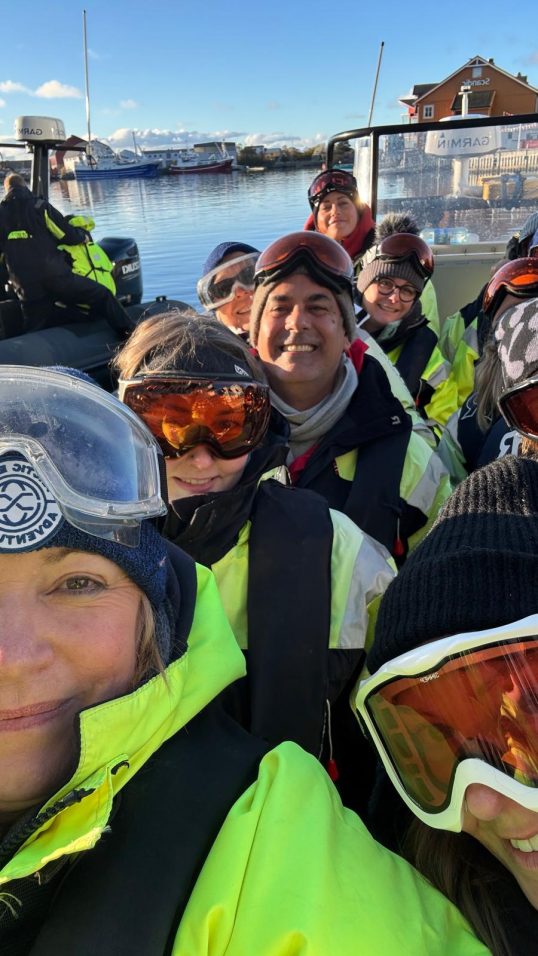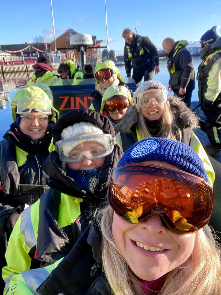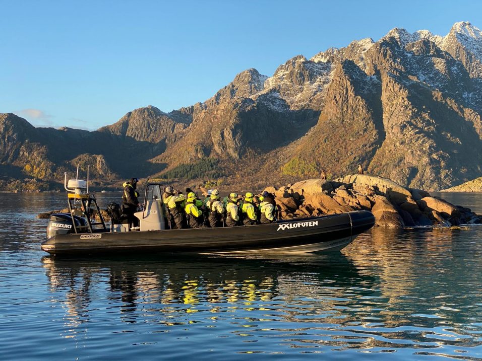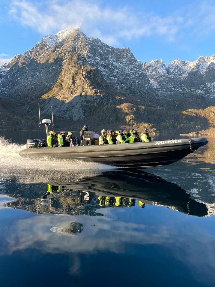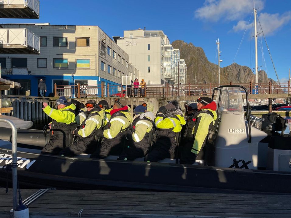 Bei strahlendem Sonnenschein ging es am Nachmittag sportlich weiter. Für beide Gruppen stand das „RIB (Rigid Inflatable Boat) auf dem Programm. Waren wir heute morgen noch eher beschaulich im Kajak um Svolvaer und im Kutter unterwegs, sollten wir jetzt das genaue Gegenteil erfahren. Wieder – liebe Pflichtkür -wurden wir in dicke Overalls verpackt, mit Schwimmwesten ausgerüstet und auf zwei PS starke Boote verteilt.